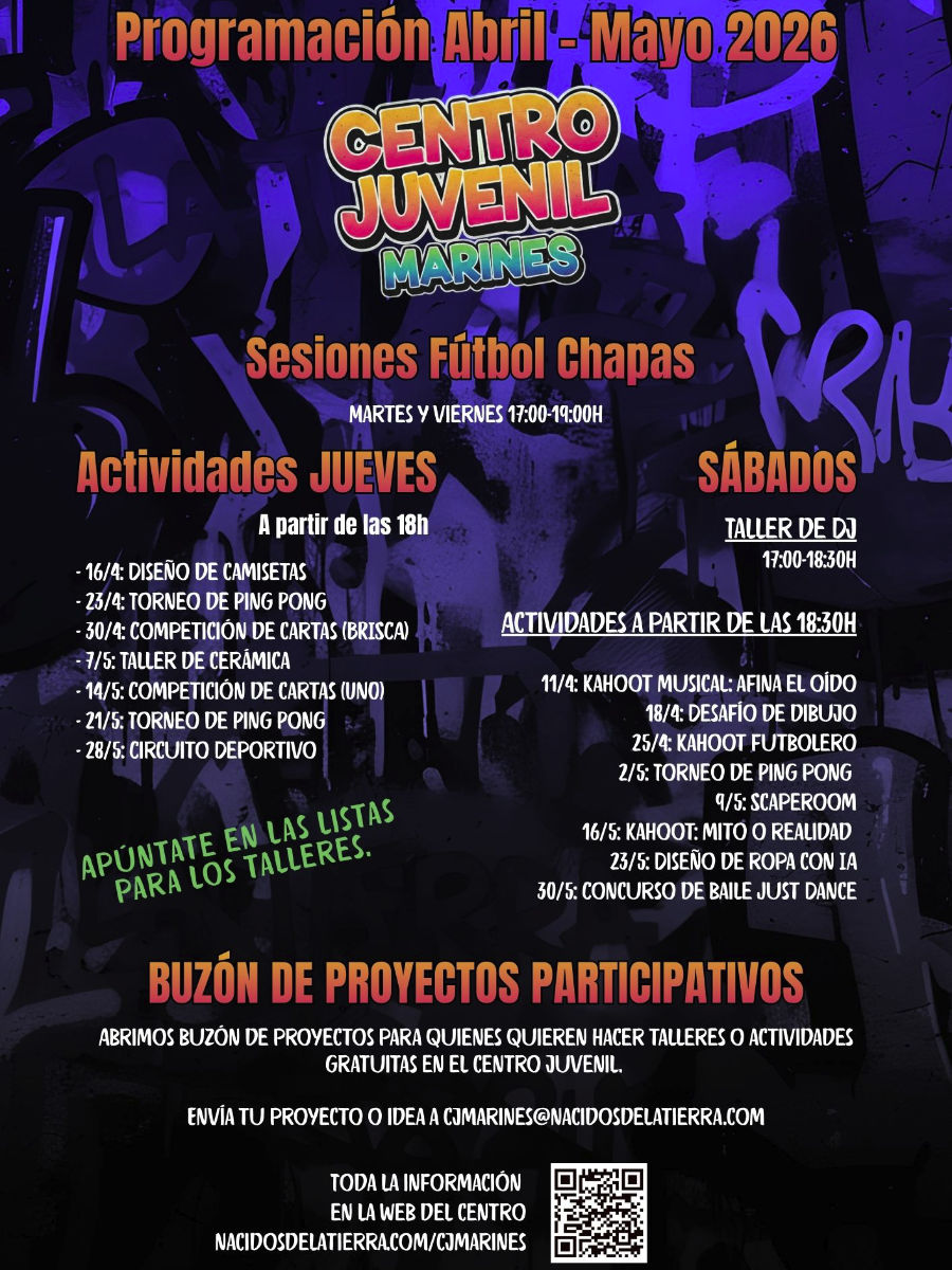 Ya tenemos aquí la programación de abril y mayo de 2026 del Centro Juvenil de Marines, un espacio que seguimos impulsando desde Nacidos de la Tierra para que la juventud tenga un lugar donde expresarse, compartir y disfrutar de su tiempo libre de forma positiva 🙌